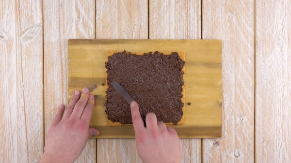 - Faites d'abord fondre le chocolat noir au bain-marie. Mélangez ensuite délicatement les miettes de gaufrettes et étalez le mélange uniformément sur le carré de pâte. Mettez au frais.