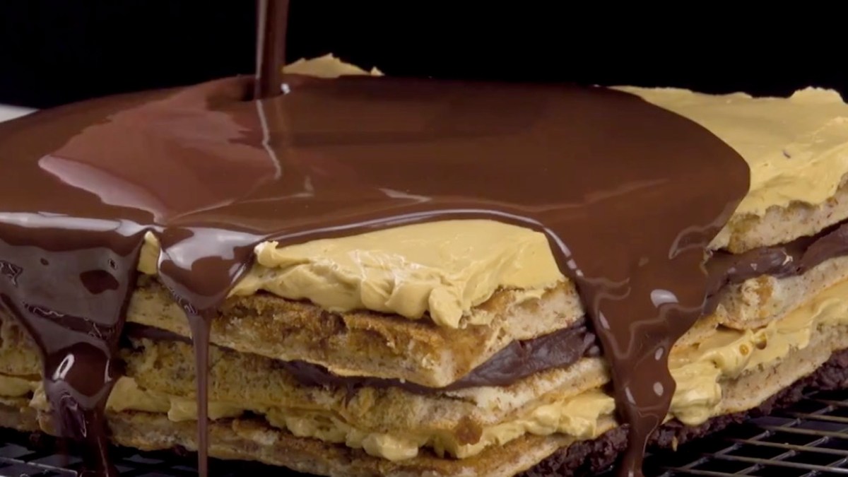 - Placez une grille sur une plaque de cuisson profonde et mettez le gâteau sur cette grille. Versez maintenant le chocolat fondu uniformément sur la surface. Laissez ensuite refroidir le glaçage.Enfin, coupez les bords et coupez votre gâteau en petites portions. Le chef-d'oeuvre est prêt !