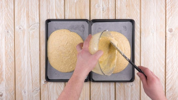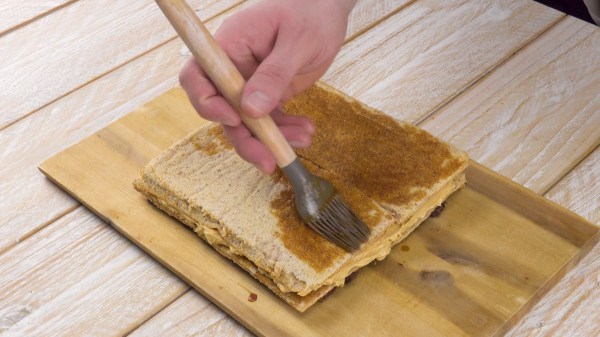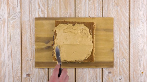- Étalez la moitié de la crème sur le côté enduit de café de la base du gâteau. Recouvrez maintenant la couche de crème avec le carré (composé des excédents de pâtes de la première étape) et enduisez-le lui aussi de café.