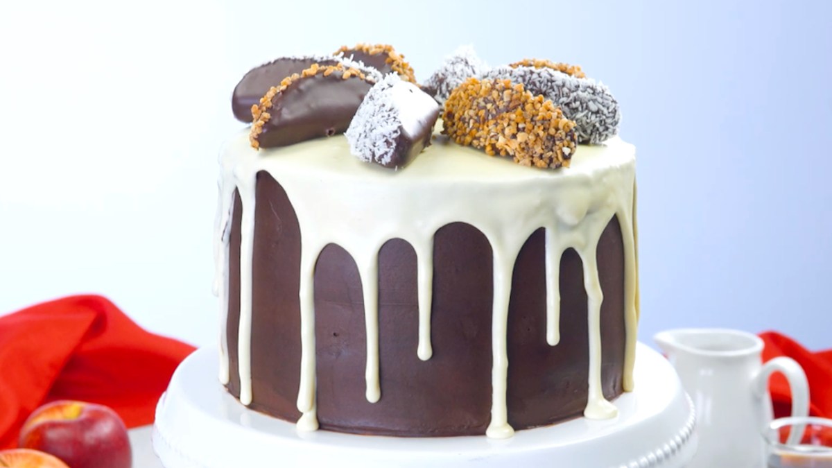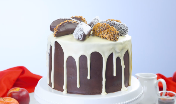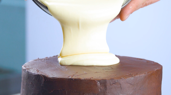 - Faites chauffer la crème, sans la faire bouillir, et versez-la sur le chocolat blanc haché. Mélangez avec une spatule en caoutchouc jusqu'à ce que le tout soit bien mélangé. Laissez refroidir un peu puis versez la ganache blanche sur le gâteau pour qu'elle coule tout autour.