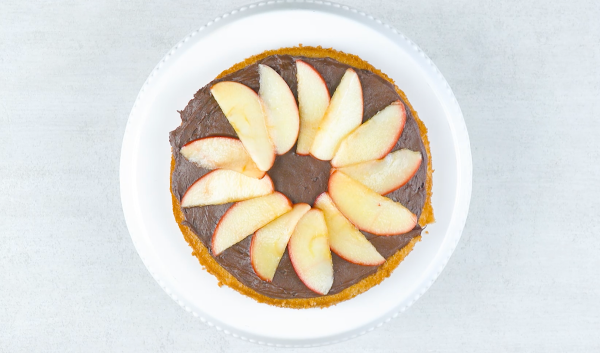 - Placez les tranches de pommes avec les flocons de coco et les noisettes concassées sur le gâteau.