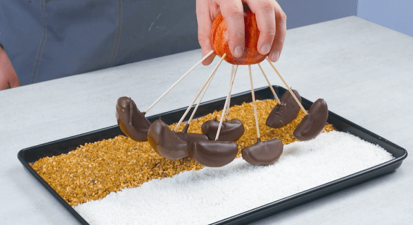 - Épluchez et coupez une pomme en huit. Faites fondre le chocolat. Embrochez les morceaux de pommes sur des brochettes en bois et trempez-les dans le chocolat fondu. Ensuite, il faut bien les égoutter et les tremper dans des flocons de coco ou des noisettes concassées.