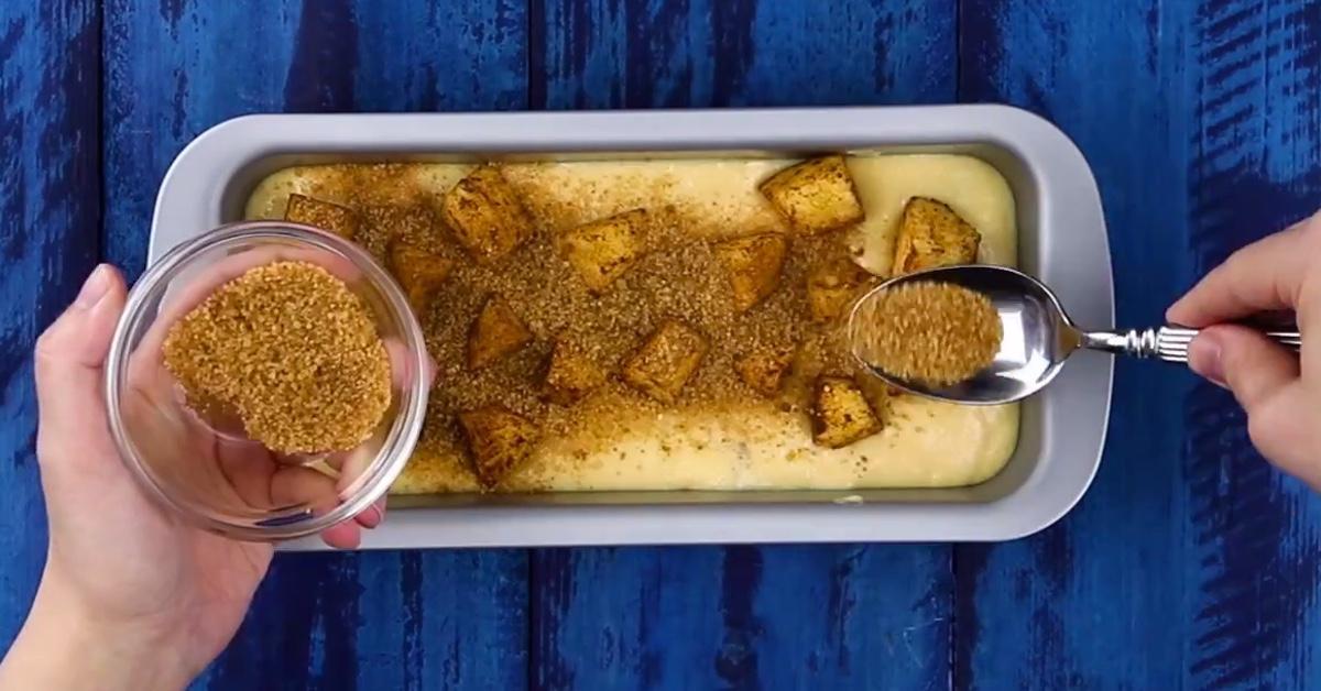 - Versez la moitié de votre préparation dans un moule à cake et ajoutez dessus la moitié des morceaux de pommes-cannelle.