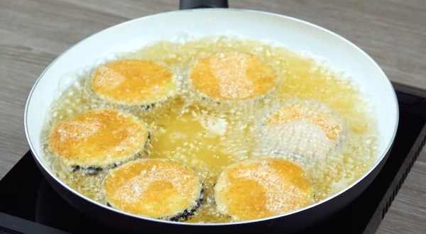 • Coupez une aubergine en tranches d'environ 0,5 cm d'épaisseur, salez et poivrez. Trempez les tranches d'abord dans la farine, puis dans l'œuf battu et enfin dans la chapelure. Faites frire les aubergines à environ 160 °C dans de l'huile bouillante jusqu'à ce qu'elles soient bien dorées. Ensuite, laissez-les sécher sur du papier absorbant.