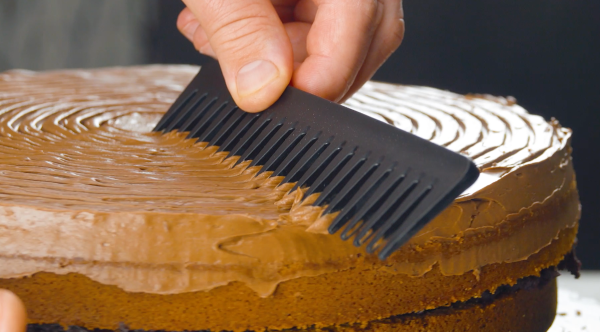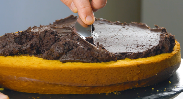 - Retournez le gâteau refroidi et coupez-le en deux dans le sens de la longueur. Étalez la crème au chocolat noir sur une moitié et placez l'autre moitié du gâteau sur le dessus.Ensuite, étalez la crème au chocolat léger sur le gâteau et dessinez des rainures dans la crème avec un peigne.Recouvrez l'extérieur du gâteau avec le reste de la crème au chocolat foncée et étalez la crème à l'aide d'une cuillère du bas vers le haut de manière à obtenir un aspect d'écorce d'arbre. Mettez le gâteau au frais pendant au moins 2 heures.