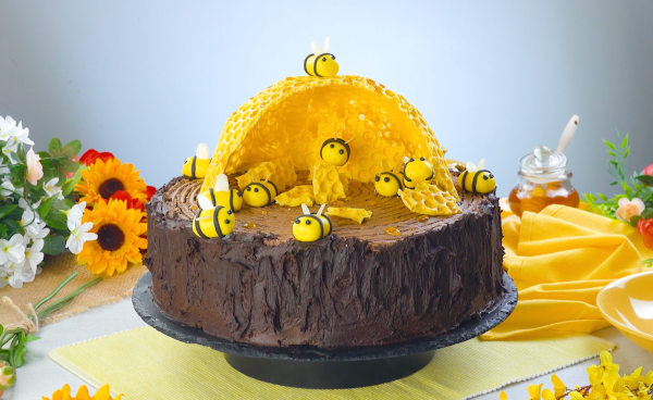 Décorez le gâteau avec les morceaux cassés de la ruche et les abeilles en fondant. Répandez également un peu de miel sur le gâteau. Ce gâteau en forme d’abeille est déjà une réussite visuelle, mais le goût vous finira de vous convaincre. La combinaison de la pâte moelleuse au miel, de la crème onctueuse au chocolat et du chocolat croquant de la ruche est a-bzzz-olument délicieuse. Bon Ap’ !