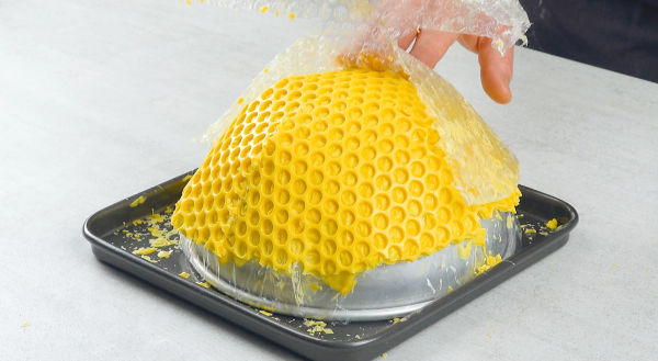 - Faites fondre le chocolat blanc et colorez-le avec du colorant alimentaire jaune. Découpez quatre fentes dans un morceau rond de papier bulle à intervalles de 90 degrés (du bord au centre). Badigeonnez le papier bulle avec le chocolat jaune et placez-le sur un saladier (retourné) enveloppé de film alimentaire. Laissez le chocolat durcir, puis retirez délicatement la feuille de papier bulle.