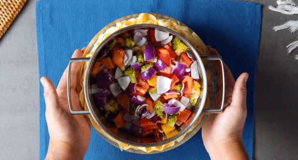 - Égouttez les pâtes et versez-les uniformément dans un plat à four graissé. Placez ensuite une casserole au centre des pâtes, dont vous aurez préalablement graissé le fond. Laissez la casserole sur les pâtes et mélangez le poivron, le brocoli, les oignons, le sel, le poivre et l'huile d'olive dedans.