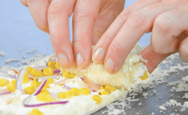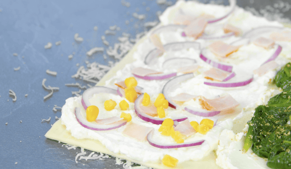 - Étalez du fromage frais sur le reste de la pâte et répartissez des oignons, du jambon cuit et du maïs dessus.