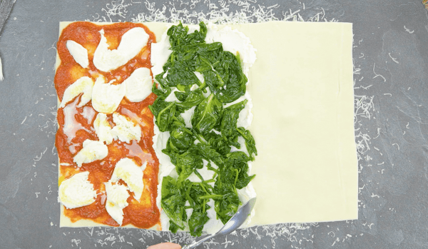 - Enduisez le deuxième tiers de la pâte de ricotta. Faites sauter les épinards dans du beurre et répartissez-les sur la ricotta. Râpez de la noix de muscade sur les épinards.