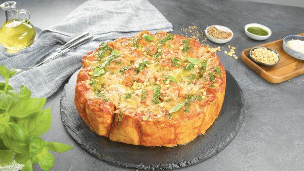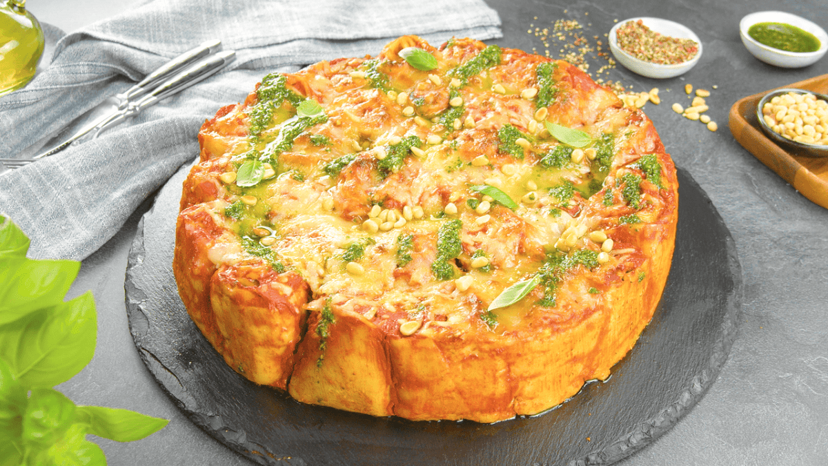 - Décorez le gâteau de pizzas roulées avec du pesto, des pignons de pin grillés et du basilic frais.
