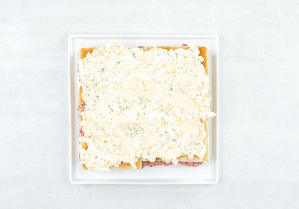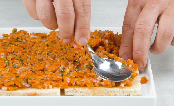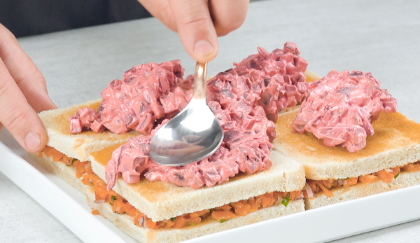 - Placez 4 toasts l'un à côté de l'autre pour former un carré. Étalez le mélange de saumon et d'oignon sur les tranches de pain grillé. Placez ensuite 4 autres tranches de pain grillé par dessus.
