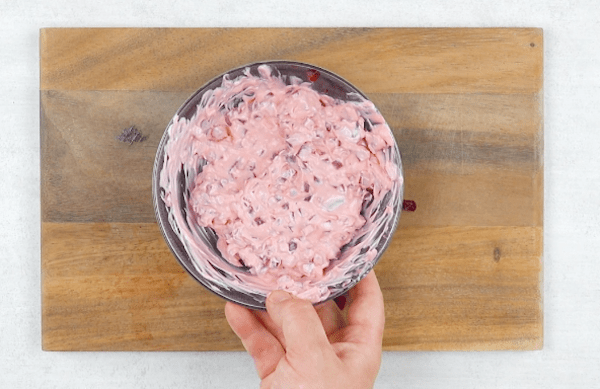 - Coupez une betterave en petits cubes à l'aide d'un coupe-œuf et placez-la dans un bol. Ajoutez la mayonnaise, le fromage frais et le jus de citron et mélangez le tout.
