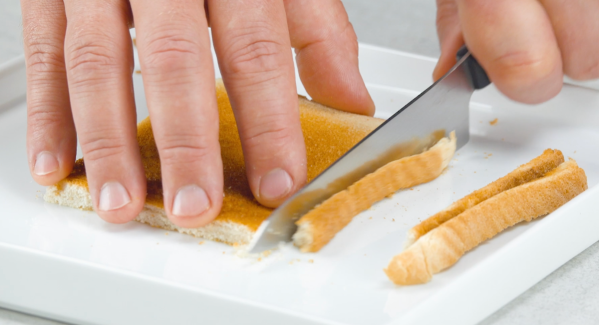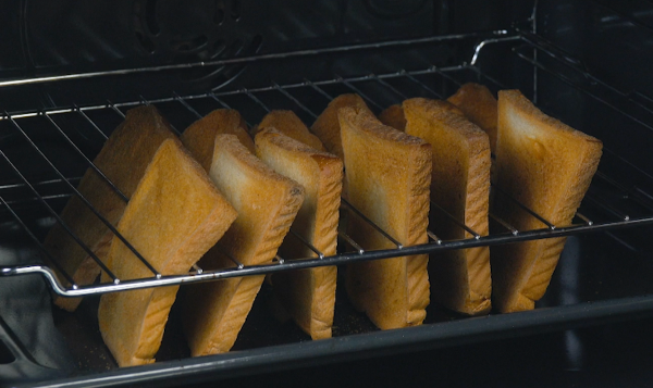 - Faites d'abord dorer les 12 tranches de pain grillé dans le four pendant 10 à 15 minutes à 170 °C.