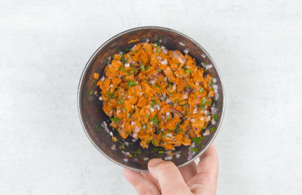 - Coupez le saumon fumé en petits morceaux et mettez-le dans un bol. Ajoutez l'oignon finement haché, le persil, l'huile, le jus de citron et mélangez le tout. Assaisonnez avec du sel et du poivre.