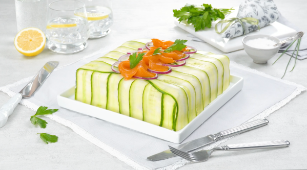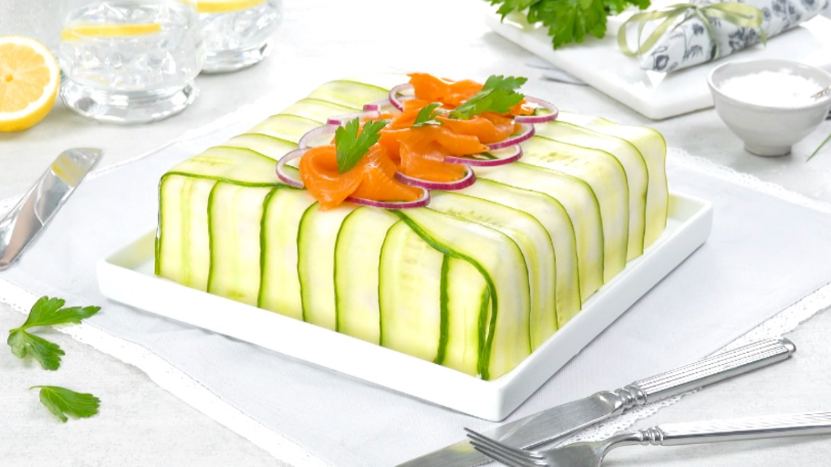 - Coupez un concombre en deux et épluchez de longues et fines lamelles avec un économe. Recouvrez tout le gâteau avec ces fines tranches. Garnissez le gâteau de saumon, d'oignons et de persil et mettez-le au frais pendant au moins 2 heures.