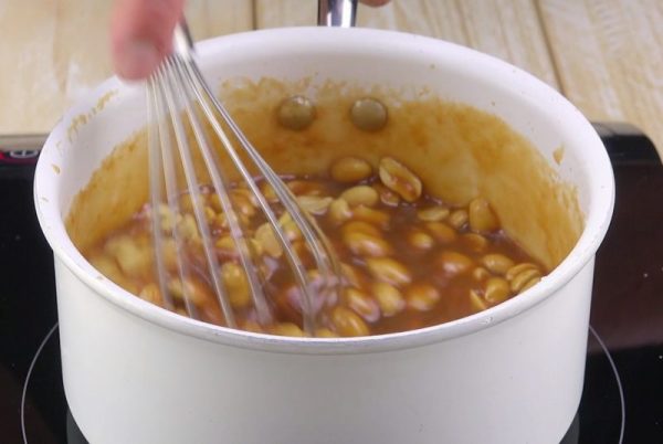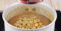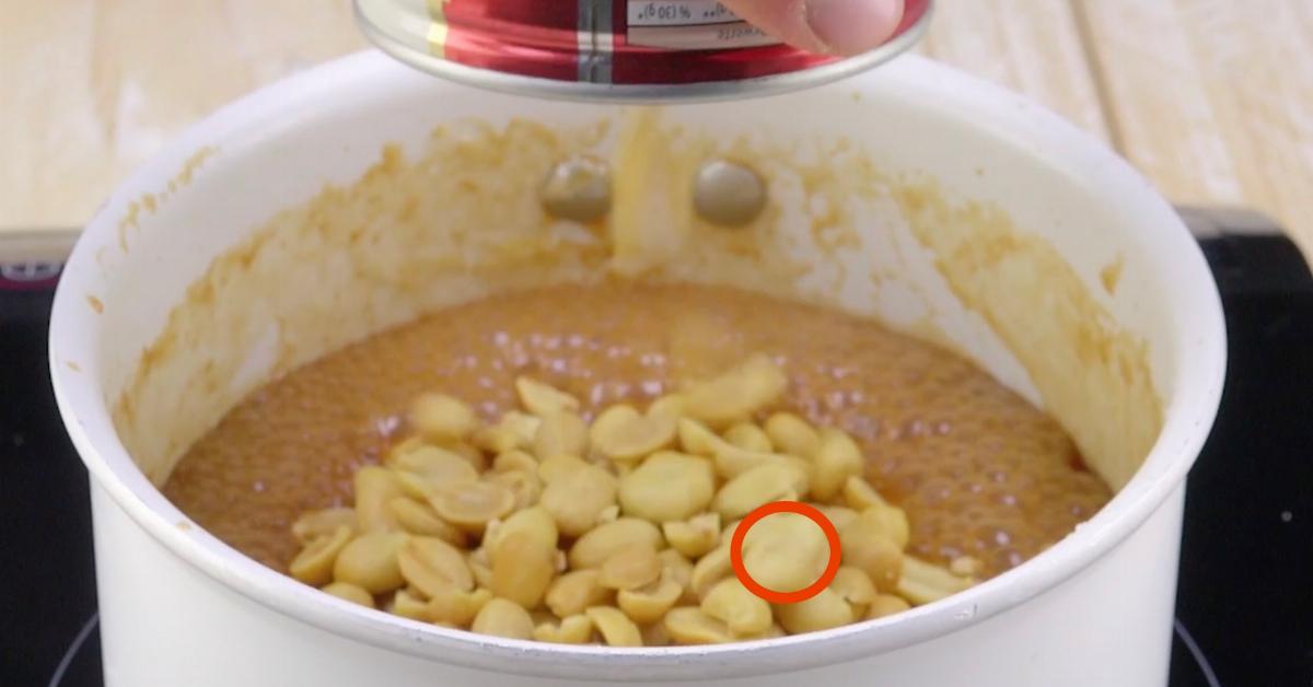 • Faites caraméliser le sucre dans une casserole jusqu'à ce qu'il soit doré et ajoutez ensuite la crème. Mélangez bien. Maintenant, ajoutez les cacahuètes et laissez refroidir un peu. Répartissez ensuite le caramel aux cacahuètes sur la base du gâteau dans le moule.