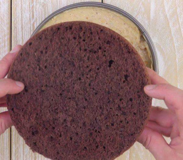 • Étalez la crème à la cacahuète sur le caramel, placez par-dessus l'autre moitié du gâteau au chocolat et mettez au frais pendant une heure. Retirez ensuite le gâteau du moule.