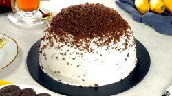 - Coupez le gâteau au chocolat à l'horizontale en deux morceaux. Posez un bol retourné au centre de l'une des moitiés et découpez tout autour du gâteau. Recouvrez le bol avec du film alimentaire et placez soigneusement la moitié non découpée du gâteau à l'intérieur. Versez du lait sur le gâteau pour qu'il soit bien juteux.