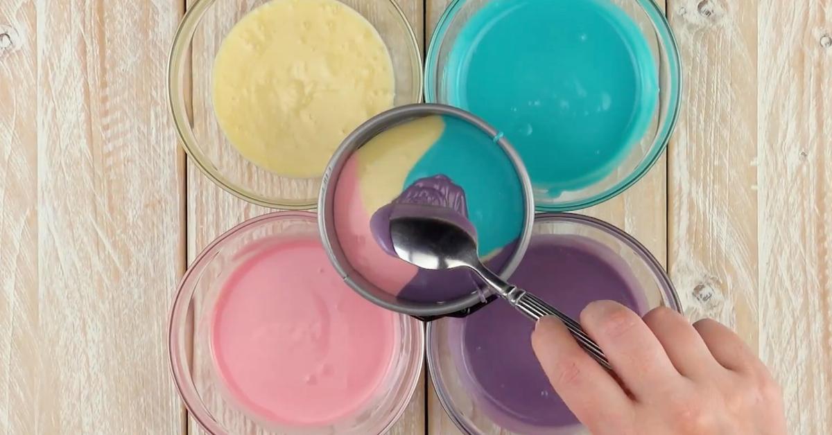 - Divisez la pâte en quatre portions égales dans des saladiers différents. Colorez trois d'entre eux : un en bleu, l'autre en violet et un autre en rose. Versez ensuite des cuillères de chacune des portions de pâte dans un petit plat à charnière (10 cm de diamètre) puis mélangez légèrement pour faire un effet marbré. Enfournez à 175 °C pendant 35 minutes.
