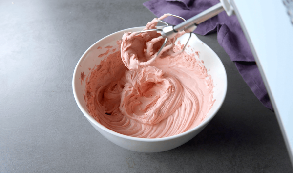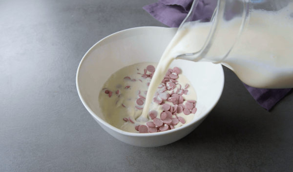 - Préparez d'abord la crème au chocolat ruby en versant la crème chaude sur le chocolat ruby et en le laissant fondre complètement. Placez ensuite le mélange au réfrigérateur pendant 2 heures.