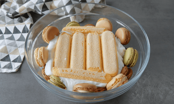 - Recouvrez le fond et les côtés du saladier d'environ 30 macarons et répartissez ensuite la crème fouettée sur ceux-ci. Disposez ensuite les boudoirs sur la crème.