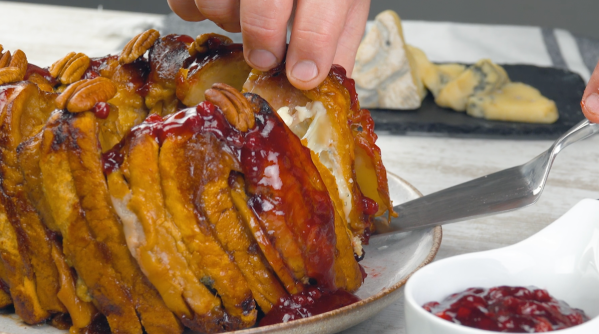 - Étalez du gorgonzola sur la plus grande moitié du pain de mie. Coupez le filet de porc en tranches que vous faites revenir à la poêle. Assaisonnez la viande avec du sel et du poivre. Posez une tranche de filet de porc sur le gorgonzola. Coupez la poire en tranches, dans le sens de la longueur, et placez une tranche sur la viande. Posez maintenant l'autre moitié du toast sur le reste et étalez de la confiture de canneberges dessus. Répétez les étapes avec le reste des ingrédients et placez le tout à la verticale dans un moule à kougloff graissé. Enfournez le tout pendant 30 minutes à 175 °C, en mode convection et après la cuisson, garnissez le gâteau de confiture de canneberges et de noix de pécan.