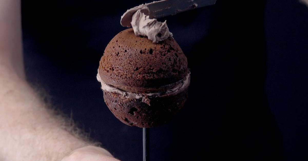 - Tartinez une moitié de chaque paire de gâteaux avec la crème au beurre chocolatée puis pressez délicatement l'autre moitié sur le dessus de façon à former une boule. Retirez ensuite le récipient du dessus.