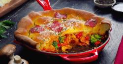 - Saupoudrez un peu de farine sur le plan de travail et étalez la pâte à pizza déjà préparée de façon à ce qu'elle soit légèrement plus grande que la poêle utilisée. Déposez ensuite la pâte sur le dessus du moule et pressez-la légèrement autour du bord. Étalez l'huile d'olive sur la pâte à l'aide d'un pinceau.