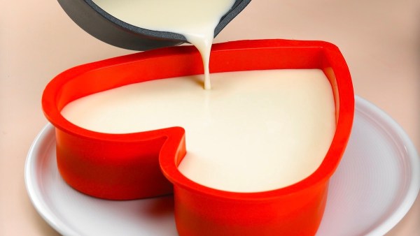 • Faites d'abord tremper la gélatine dans de l'eau. Ensuite, faites chauffer de l'eau dans une casserole et dissolvez la gélatine préalablement trempée dans celle-ci. Mélangez les trois types de lait ensemble, puis incorporez progressivement le mélange à la gélatine dissoute. Graissez le moule en forme de cœur avec un peu d'huile, puis versez-y environ la moitié du liquide blanc. Placez le moule et le pudding dans un endroit frais pendant environ 2 heures jusqu'à ce que le pudding ait durci.