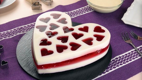 • Détachez soigneusement la gelée des bords du moule avec un petit couteau avant de démouler le gâteau. Servez ce joli cœur avec une sauce à la vanille.
