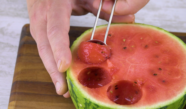 • Coupez une pastèque en deux et coupez également un morceau du dessous pour qu'elle soit stable. Évidez la pastèque à l'aide d'une cuillère parisienne.