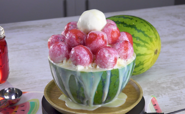 • Remplissez la moitié creusée de la pastèque avec les flocons de glace et placez les boules de pastèque par-dessus. Enfin, déposez une boule de glace à la vanille sur le dessus et nappez le tout de lait concentré.