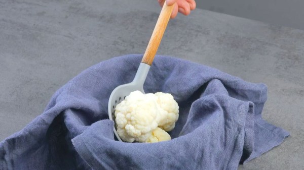 - Retirez les feuilles du chou-fleur et mettez environ 400 g des fleurons dans de l'eau salée. Laissez bouillir pendant environ 20 minutes, puis retirez le chou-fleur de l'eau avec une écumoire et posez-le sur un torchon. Fermez le tissu avec vos mains et pressez le tout pour extraire l'eau du chou-fleur.