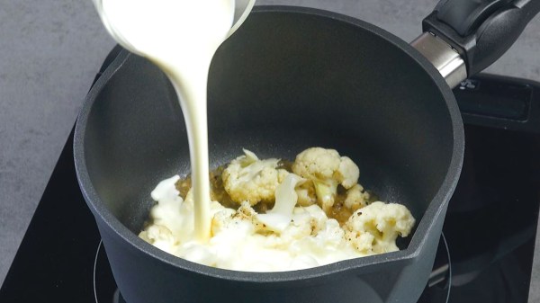 - Coupez un demi oignon et une gousse d'ail en petits cubes et mettez-les dans une casserole avec un peu d'huile. Ajoutez le chou-fleur puis versez le vin blanc et la crème sur le tout. Laissez la sauce mijoter à feu doux pendant environ 10 minutes et réduisez-la en purée à l'aide d'un mixeur.