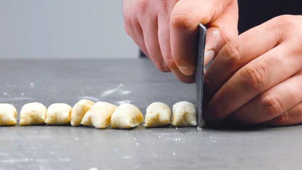 - À l'aide d'un grattoir à pâtisserie, découpez chaque rouleau en morceaux d'environ 5 cm de long. Saupoudrez les morceaux de pâte d'un peu de farine et roulez-les un par un sur un peigne propre pour donner aux gnocchi leur forme typique.