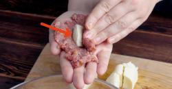 - Prenez une portion du mélange de viande hachée dans votre main et formez une sorte de galette. Placez ensuite un morceau de mozzarella au centre, entourez-le avec la viande et formez une boule. Répétez l'opération jusqu'à ce que vous ayez 12 petites boulettes de viande farcies devant vous.