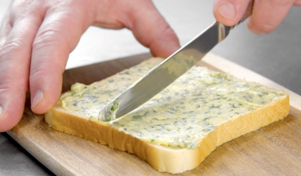 - Mélangez le beurre avec le persil, l'ail et le sel. Tartinez le beurre aux herbes sur 5 tranches de pain de mie, puis coupez les tranches en deux.