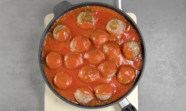 - Faites revenir les boulettes de viande de tous les côtés, puis versez la sauce tomate et laissez mijoter le tout pendant 10 minutes.