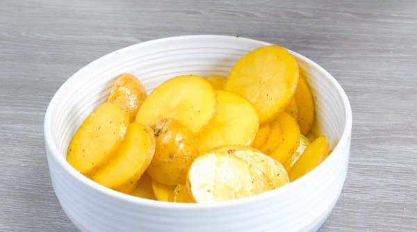 - Lavez les pommes de terre et coupez-les en fines tranches avec leur peau. Mélangez-les ensuite avec de l'huile d'olive et assaisonnez-les avec du sel et du poivre. Laissez ensuite reposer le mélange pendant 10 minutes.