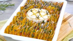- Répétez cette opération jusqu'à ce que le plat soit entièrement rempli de bacon et de pommes de terre. Découpez ensuite une grille dans la couche supérieure du camembert et insérez quelques brins de romarin effeuillés ainsi que les gousses d'ail coupées en deux dans les incisions.