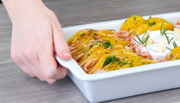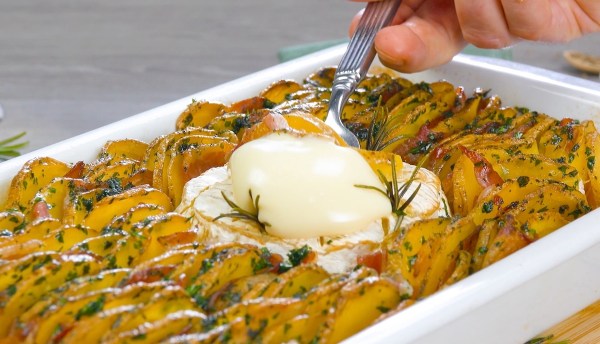 Normalement, un gratin est gratiné avec du fromage, mais pas ici. Au milieu de notre gratin de pommes de terre avec du bacon se trouve en effet un camembert qui, une fois coupé après la cuisson, fait office de bassin de fromage liquide. De quoi faire saliver les amateurs de fromage fondu. On vous montre :