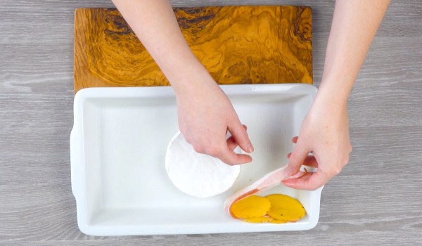 - Graissez un plat allant au four avec du beurre et mettez le camembert au centre du plat. Placez ensuite deux tranches de pommes de terre sur le bord du plat et recouvrez-les de la moitié d'une tranche de bacon. Recouvrez à nouveau cette dernière de deux tranches de pommes de terre et rabattez sur celles-ci l'autre moitié de la tranche de bacon.
