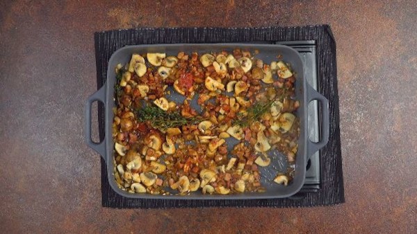 - Mettez maintenant les lardons dans la poêle et faites-les revenir avec les oignons en dés et l'ail haché dans le reste de l'huile. Ajoutez ensuite les champignons, le thym et le concentré de tomates.