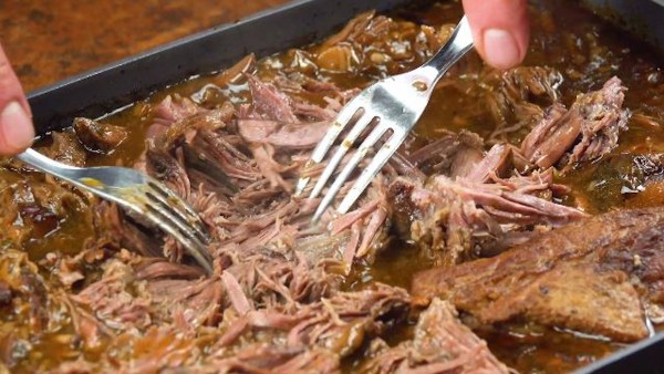 - Retirez l'os de la viande dès que vous l'avez sortie du four. Ensuite, séparez la viande avec deux fourchettes. Mettez la viande sur la pâte à tarte déjà précuite dans le plat à gratin et saupoudrez le mélange de pommes de terre en plusieurs petites tours. Remettez le tout au four, cette fois-ci pendant 5 minutes à 180 °C, en mode convection.