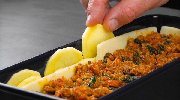 - Recouvrez la viande hachée de tranches de pommes de terre et mettez une autre couche de fromage par-dessus. Remettez de la viande hachée sur le dessus. Répétez l'opération jusqu'à ce que les couches aient atteint le bord supérieur des pommes de terre présentes sur les bords. Poussez ensuite d'autres tranches de pommes de terre latéralement pour pouvoir les superposer encore plus haut.