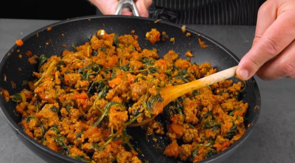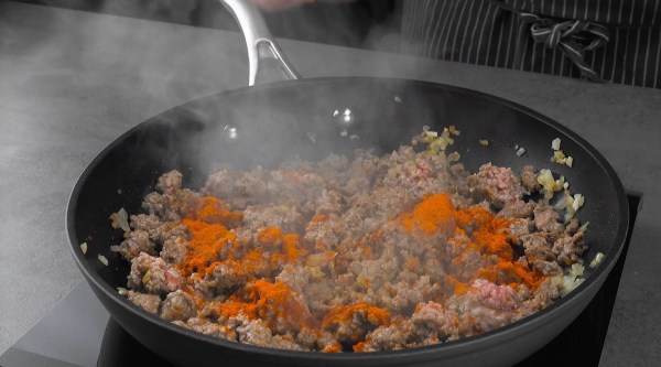 - Faites chauffer de l'huile dans une poêle et faites revenir les oignons et l'ail. Ajoutez la viande hachée et assaisonnez de paprika.