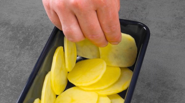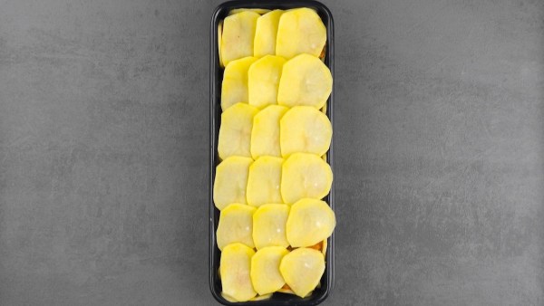 - Pelez les pommes de terre et coupez-les en tranches fines. Utilisez-les pour recouvrir le fond et les côtés d'un moule (environ 30 cm x 11 cm). Pour éviter qu'elles crament, nous vous recommandons de tapisser le moule de papier sulfurisé ou de le graisser généreusement avec du beurre ou de l'huile.