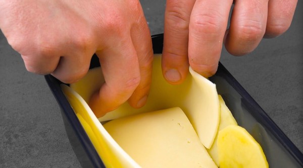 - Recouvrez maintenant les tranches de pommes de terre avec le fromage.