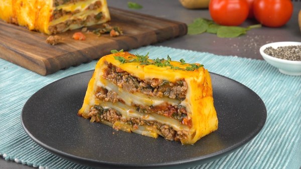 Gratin de pommes de terre à la viande hachée, épinards, tomates et fromage